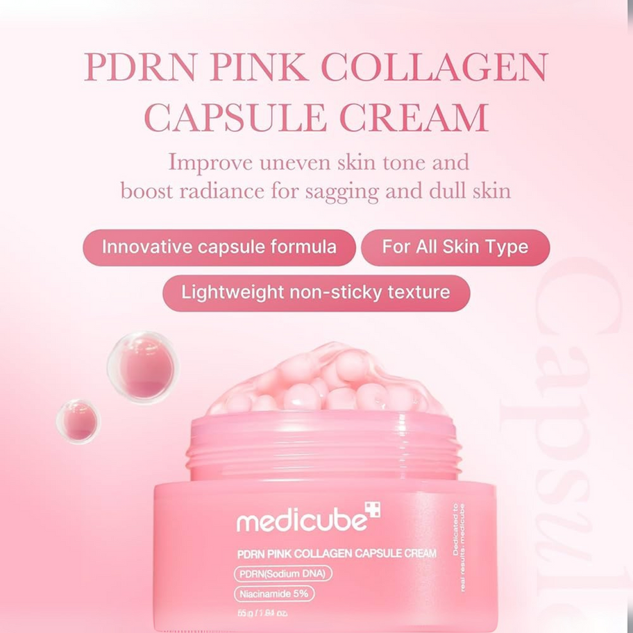 Medicube PDRN Pink Collagen Capsule Cream is an advanced anti-aging moisturizer featuring encapsulated collagen and PDRN (Polydeoxyribonucleotide) to deliver intensive firming, plumping, and revitalizing benefits. The unique capsule technology ensures that active ingredients are delivered freshly to the skin, helping to improve elasticity, reduce the appearance of fine lines and wrinkles, and restore a youthful, radiant complexion. Its rich yet non-greasy texture absorbs well and is suitable for all skin types, including sensitive and mature skin.